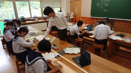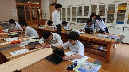 本棚や小物入れ等、自分で選んだ木工作品をつくっています。発泡スチロール製のミニチュアキットを組み立て、一枚の木材から部品を切り出していることを確認した後、設計図に従って罫書きを行いました。