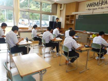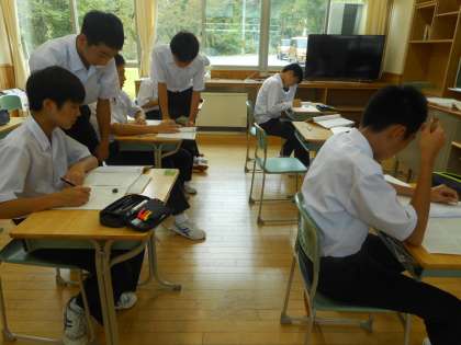 本日の学習は、1次関数の章の問題Aに取り組みます。文章問題に出てくる増加量、傾き、変化の割合等の意味を確認しながら問題を解きます。つまづいた問題については、生徒同士で教え合ったり確認し合ったりしながら、正解を求めます。