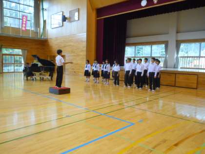 明日、オーバードホールで開催される富山市中学校文化祭に向けての合唱練習です。練習前に、会場での隊形や入退場の説明を聴きました。他校の合唱を鑑賞することができ、互いに感動を味わう1日となりそうです。