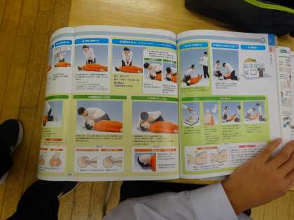 心肺蘇生法について学習しました。もしもの時に命を繋げるためにできる行動について、説明を聞いたり写真を見たりして学習しました。