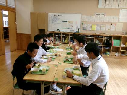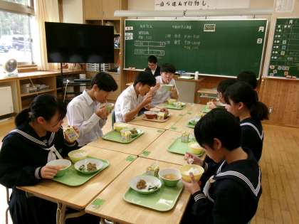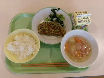 今日の給食は、豚肉の磯辺揚げ、かぶのサラダ、ポテトスープでした。