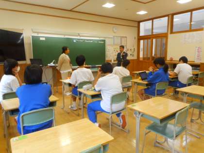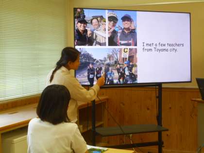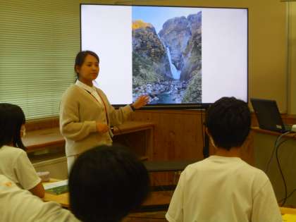 ALTが富山市マラソンに参加した時の体験談を、スライドを観ながら楽しく聞き取りました。また、富山の名所“称名滝”は1年生も訪れたことがあり、ALTの感想等を興味深く聞きました。