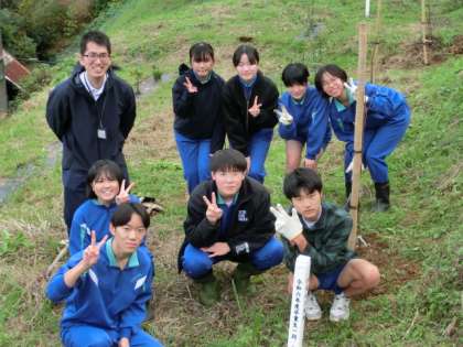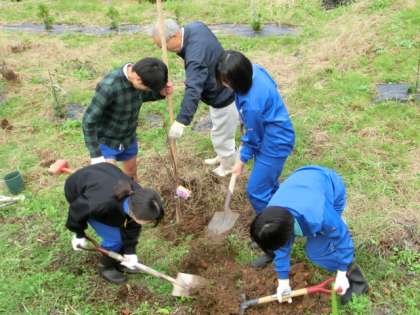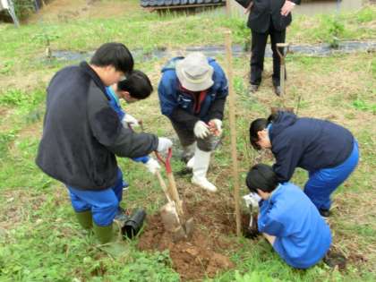 地域の方々にお世話していただき、3年生8名が卒業記念の植樹を行いました。平成26年度から継続している活動で、春には代々のハナモモが美しく咲き誇ります。今日植えたハナモモが美の共演に加わる日が待ち遠しいです。