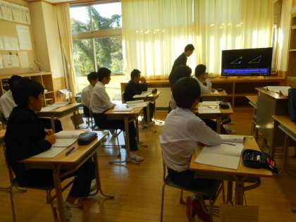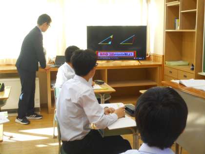 本日の学習は、「三角形の合同条件」です。2つの三角形が、合同かどうかを判断する方法を考えます。3つの合同条件を理解した後、全員で復唱して覚えました。