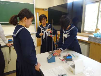 今日の課題は「エネルギーの何%が本来の目的で使われるか」です。発電機に取り付けたペットボトルを高い位置から落下させ、そのときの電流や電圧の大きさ、落下時間を計測しました。