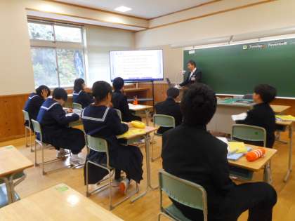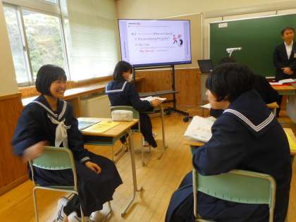 ペアになり、相手の動作について現在進行形を使っての質疑応答を練習します。ペアから聞き取った内容をノートに書き、教科担任と確認します。期末評価直後の授業でしたが、いつも通り元気よくシャドーイングに取り組むことができました。