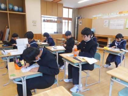 初日に受けた期末評価が、返却されました。歴史上の人物の漢字表記、誤答が多い問題、よく出題される傾向にある問題の資料の見方と解き方等について解説がありました。結果を踏まえ、1人1人が今後の学習方法や学習量を見返します。終わりに、単元のまとめを仕上げました。