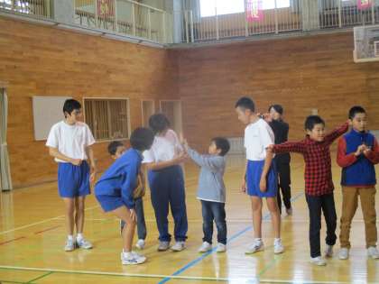 1つ目の活動は、サイレントバースデーです。言葉を使わずに、ジェスチャーだけで4月から誕生日順に並びます。指を使ったり視線を合わせたりしながら、学年の垣根を越えて楽しみました。