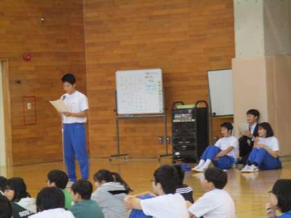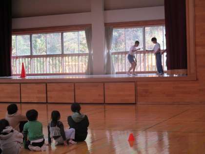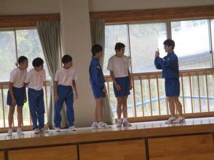 今回の小中合同集会では、生徒会執行部が中心となって企画・運営を行いました。ルール説明では、2年生がステージ上で実演をしました。小学生と中学生が、互いの仲を一層深められる集会となりました。