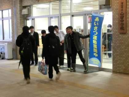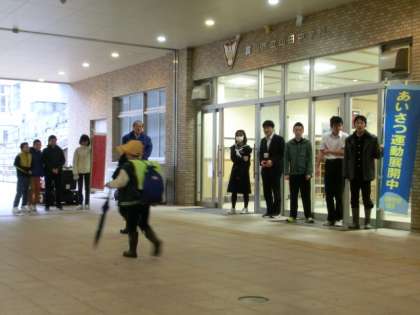 執行部や当番の生徒による元気な挨拶が、生徒玄関に響き渡っていました。挨拶運動は、13日(金)まで行います。