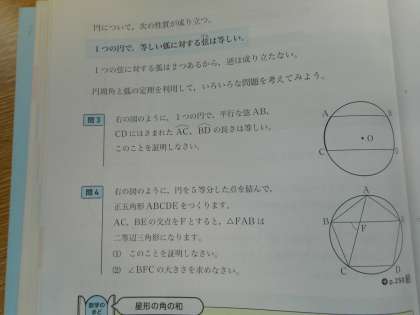 本日の学習は、「円周角の定理」です。円周角と弧の定理を引用した証明問題に取り組みます。黒板の空欄に適する角、線分、合同条件を正確に書き入れます。