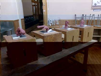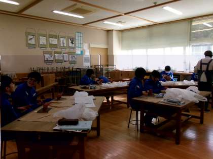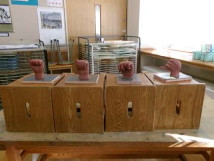 本日の学習課題は、「表したかったテーマを意識して、完成させよう」です。完成した作品を見てバランス、凹凸、質感の最終チェックをします。作品に、表したかった気持ちが伝わる題名を考えます。