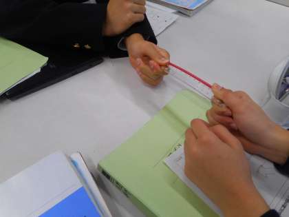 本日の学習は、「力のつり合い」です。前回の授業で、色んな形の厚紙がつり合ったときの値を記録しました。今回は、「力の向き」「力の大きさ」をワークシートに矢印で作図することで、力がつり合っているときの条件を考えます。後半は、「光の反射、屈折」の作図プリントを復習しました。