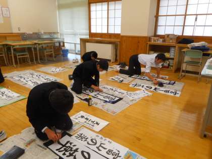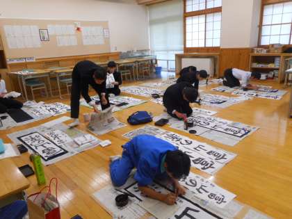 本日の学習は「毛筆」です。新学期に予定されている書初大会に備え、練習を重ねました。心を落ち着けて、課題「富山の薬(行書)」に取り組みます。