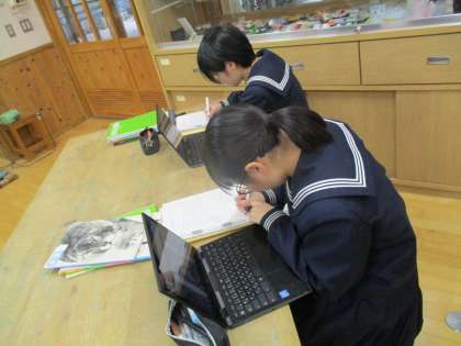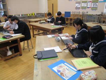 絵皿のデザインに取り組んでいます。下水道局のホームページから全国にあるマンホールのデザインを参考に、構成パターンを考えました。