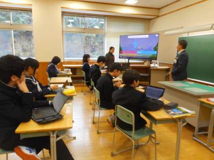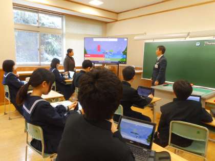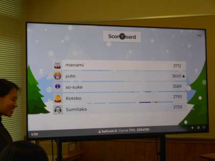 ALTを迎えての2学期最後の授業でした。既習表現を交えた質問に、4つの選択肢の中から正解を選びます。正解・不正解はもちろん、正解者の中でも解答時間によって得点が変わるので、生徒たちはとても興奮した様子でした。Xmasを前に、ALTと楽しい時間を過ごしました。