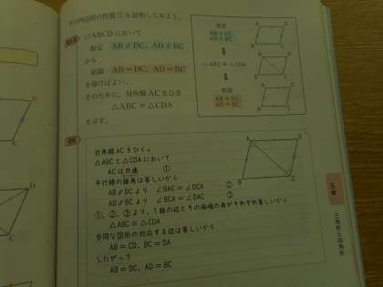本日の学習は、「平行四辺形の性質」です。平行四辺形の3個の性質を三角形の合同を導くことで、証明します。図形を描くことが早くなったことで、問題を解く時間に余裕ができるようになりました。