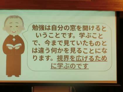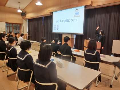 冬休みの学習について、1年生「学習習慣を身に付けよう。継続は力なり」2年生「受験生として意識を高めよう。受験用教材を使って苦手の克服を」3年生「自分のやるべきことを考えて学習しよう。過去問や受験用教材で間違えたところをしっかり復習しよう」と、学年ごとに学習のポイントを示しました。