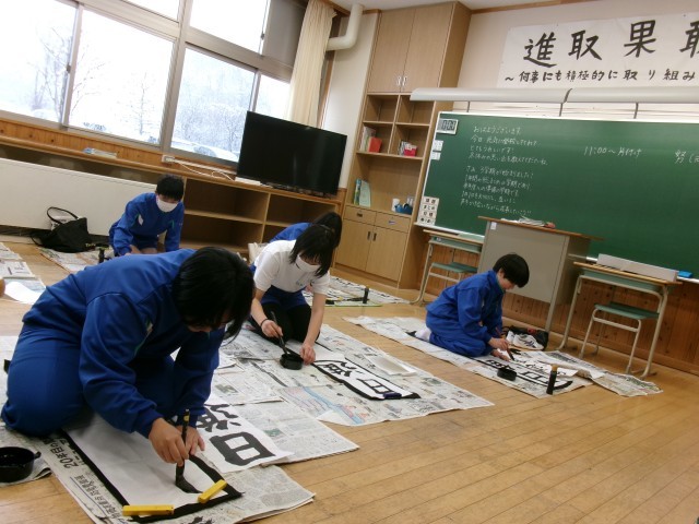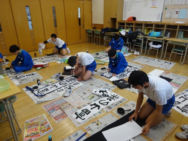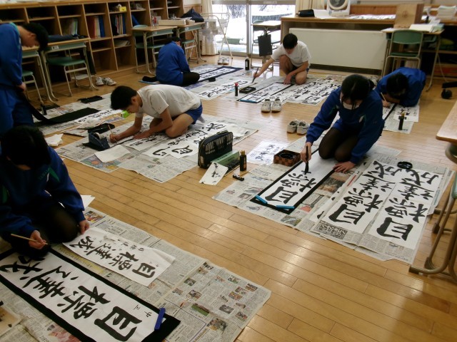 始業式後に、書初大会を行いました。心を落ち着かせて書写します。今年の課題は、1年生「日進月歩」、2年生「富山の薬」、3年生「目標達成」です。