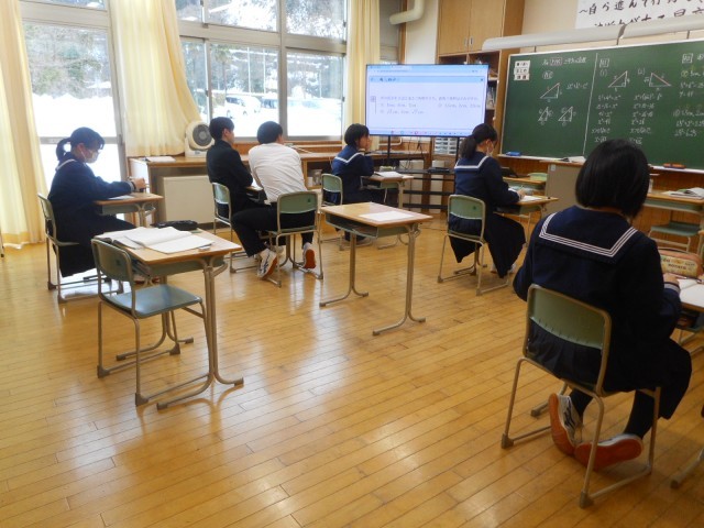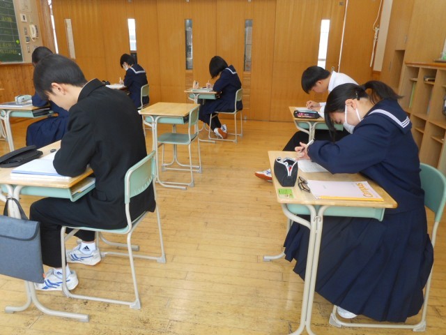 始業時に、私立高校一般入試対策問題に取り組みました。制限時間を設け、自己の実力を確認します。