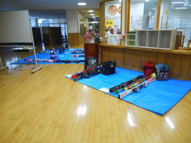 今週金曜日に、小・中合同スキー教室を予定しています。保護者の方の協力により、本日からスキー用具が搬入されています。当日に持参する生徒もいます。