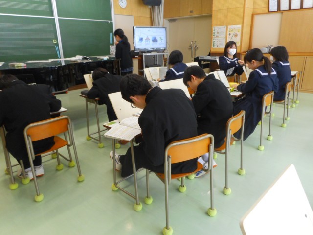 本日の学習は、卒業式での全校合唱曲の練習です。選曲した3年生の曲に対する思いを確認をしました。在校生は、感謝の気持ちを込めて練習を重ねます。本日は、楽譜づくりから始めました。