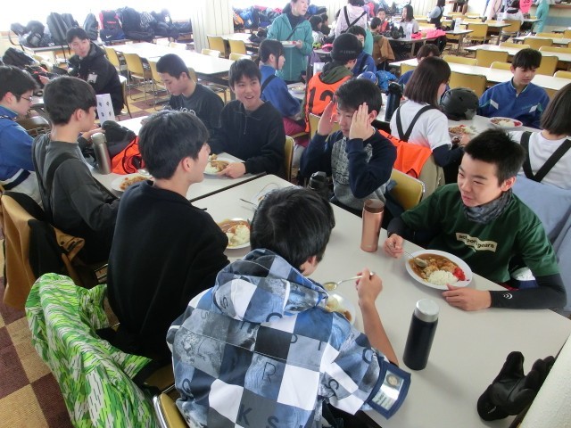 昼食は山盛りのカレーで、一気に回復しました。午後からは日が差してきて、気持ちよく滑ることができました。