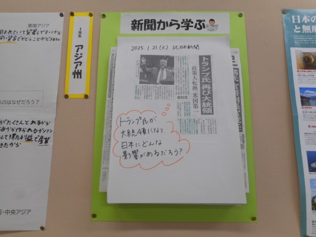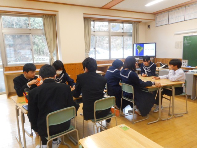 本日の学習は、地理「南アメリカ」です。主な国の名称と位置、有名な観光地等をスクリーンで確認後、白地図に川、山脈、高原等を記入することで、地形を確認しします。後半は、食品や機械類のカードを見て、日本から南アメリカへの輸出物か、逆に輸入物かを2班に分かれて、分類の理由を考えます。