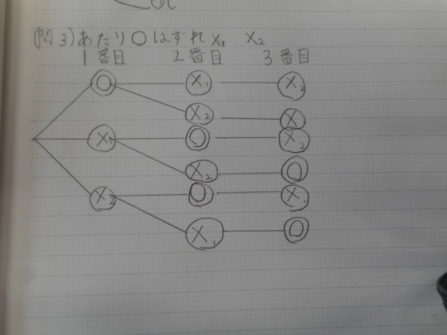 本日の学習は、「同様に確からしいこと」です。10円玉2個を2回投げた時の起こりうる場合を全て考え、確率を求めます。正確に求めるために、練習問題で「樹形図」の書き方を何回も練習します。