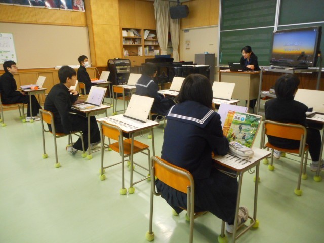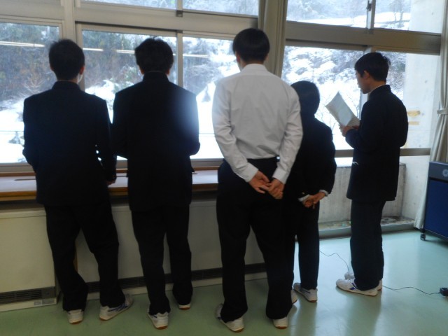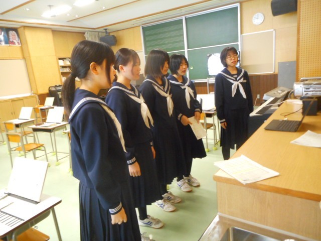 本日の学習は、教科書を離れ「卒業を祝う会」に歌う合唱曲、卒業式に歌う校歌や全校合唱曲の練習を重ねます。合唱練習時に、3年生が参加して手本を見せてくれました。