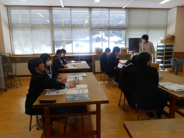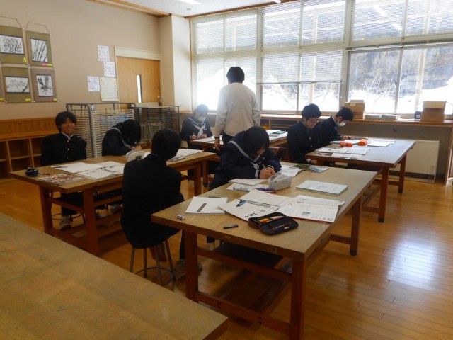 本日の学習は、「レタリングとパターンデザイン」です。前半は教科書を参考にし、明朝体とゴシック体の特徴を捉え、ワークシートの数ある書体を2種類に分けます。後半は、先輩達の作品を参考に連続するデザインを決めます。