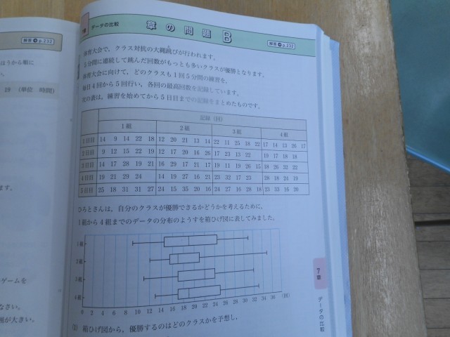 これまで学習した「箱ひげ図」の章の問題Bに取り組みます。1~4組の大縄飛び25回分データの「箱ひげ図」から、優勝クラスを予想し互いの考えを聞き合います。加えて、折れ線グラフを作成することで、予想に変化がないかをもう一度考えます。