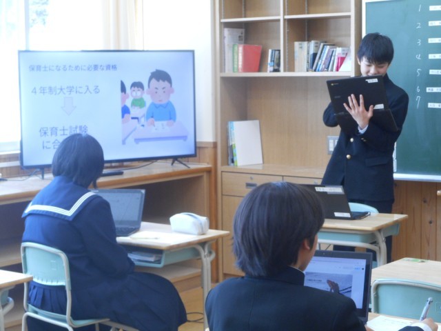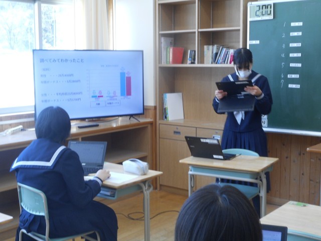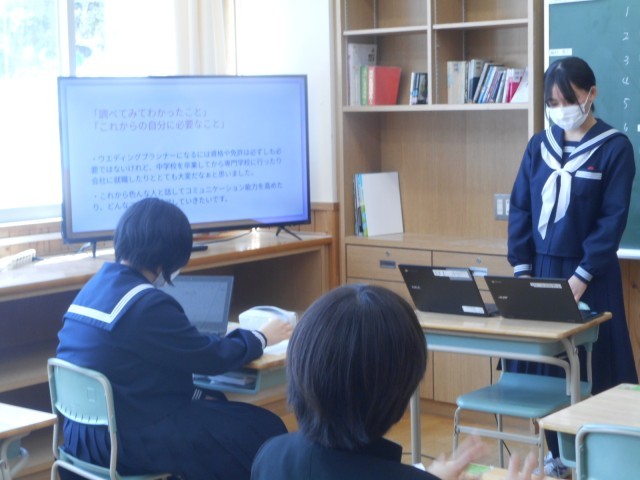 本日は、時間をかけて取り組んだ「仕事調べ」の発表です。互いの発表を聴き、ワークシートに発表の分かりやすさ、スライドの内容等について、評価を書きます。今回学習したことは、2年時の「社会に学ぶ『14歳の挑戦』」に生かします。