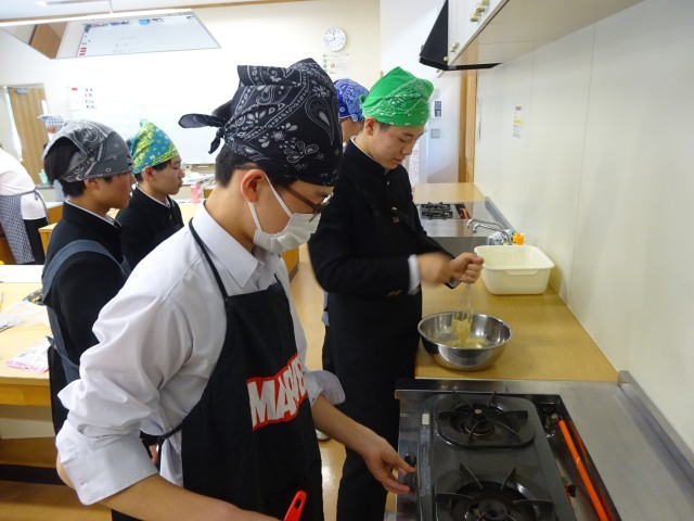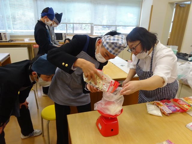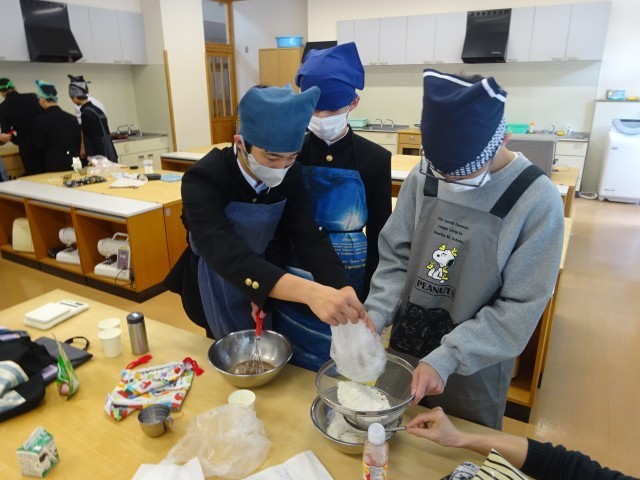 調理実習で、蒸しパンとホットケーキを作りました。班で役割分担をし、協力して取り組んでいました。