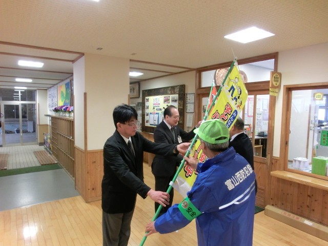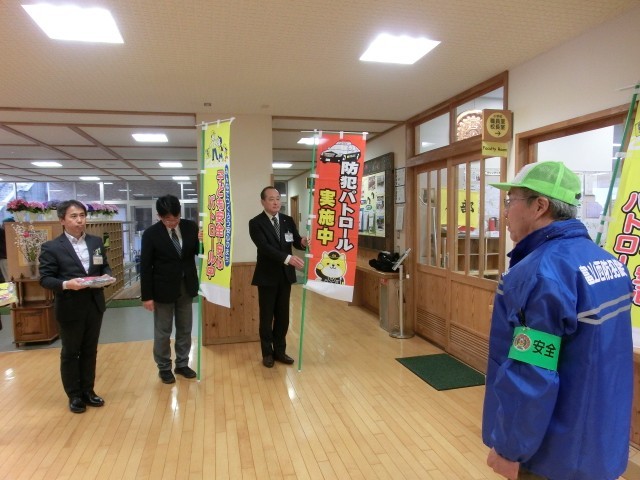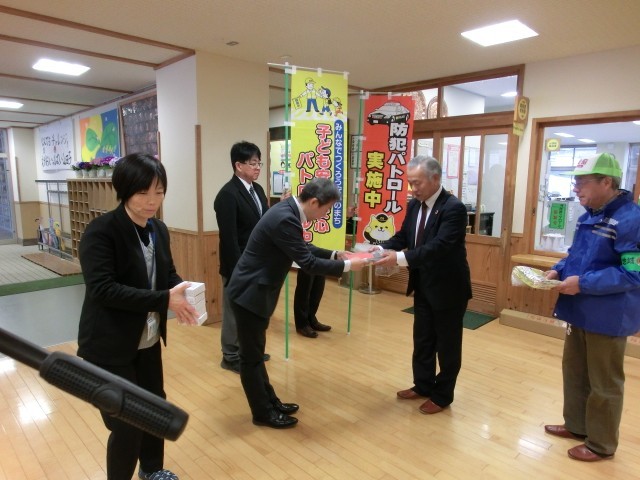 今朝、自治振興会の山田会長と防犯協会の藤丸様が来校し、「防犯パトロール実施中」と「子ども安全・安心パトロール中」の2種類ののぼり旗を10本ずつ、小・中学校に寄贈していただきました。