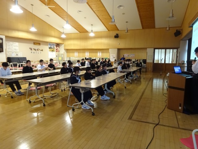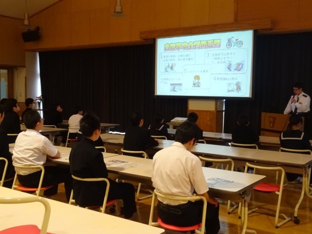 今日の6限に山田駐在所の方をお招きして交通安全教室を行いました。自転車のルールやSNSのルールについてお話しいただき、生徒たちは熱心に聞いていました。