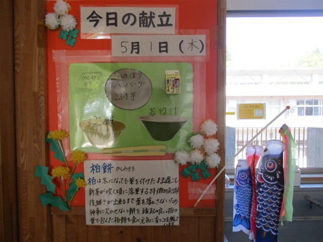 今日から5月です。朝から五月晴れとなり、廊下の献立表には、こいのぼりとたんぽぽが飾られています。
