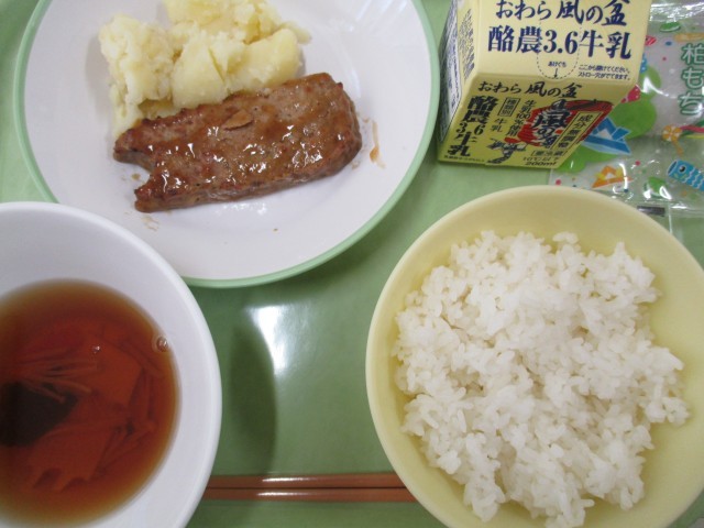 今日の給食は、ごはん、牛乳、こふきいも、こいのぼりハンバーグ、若竹汁、柏餅です。5月5日のこどもの日に向けての献立でした。