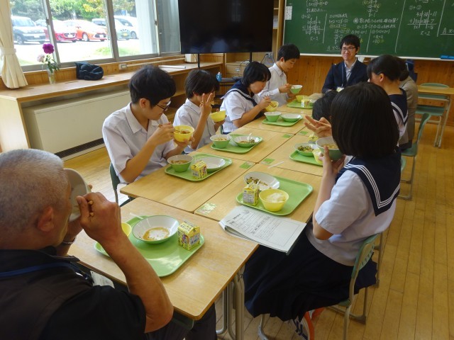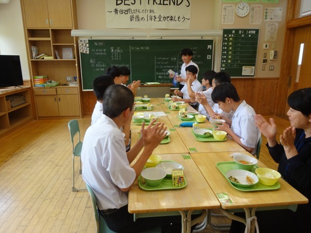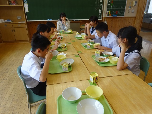 各学年の給食の様子です。今日のメニューはごはん、牛乳、焼き餃子、小松菜とひじきのナムル、エビと豆腐のうま煮です。午後からの授業に向けてエネルギーを補給しました。