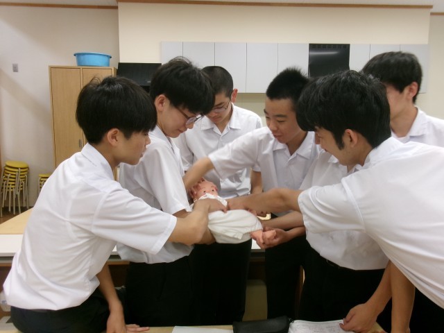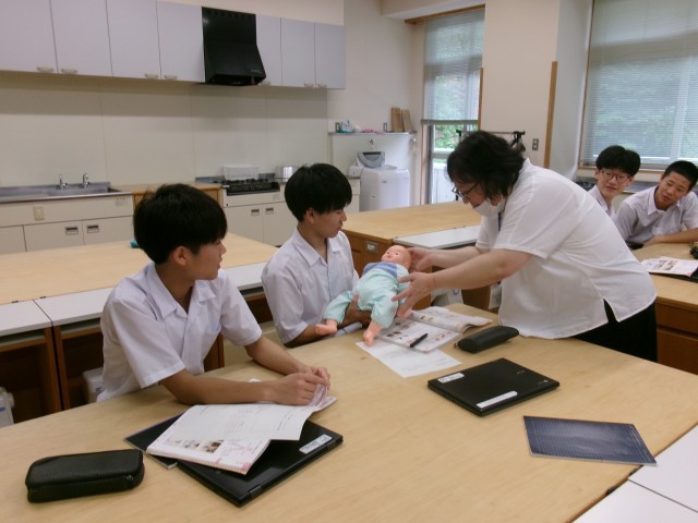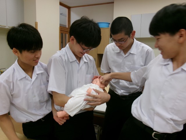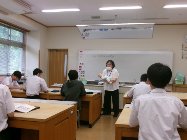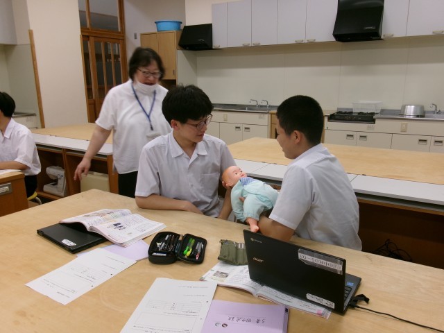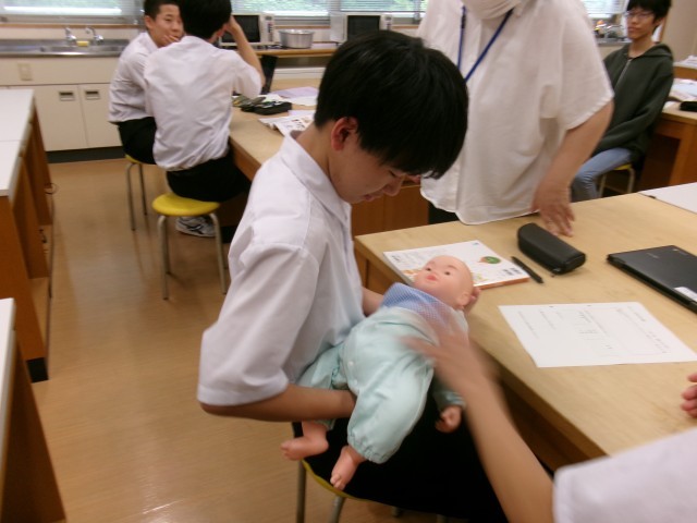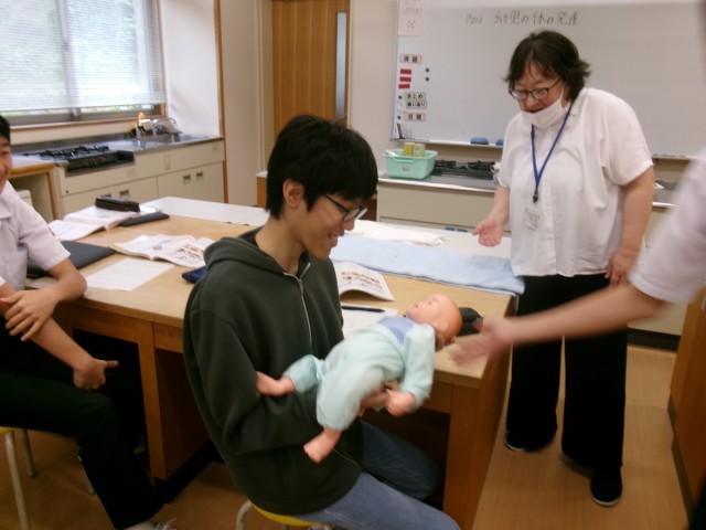 3キログラムの赤ちゃん人形をだっこし、生後間もない頃の様子を学びました。