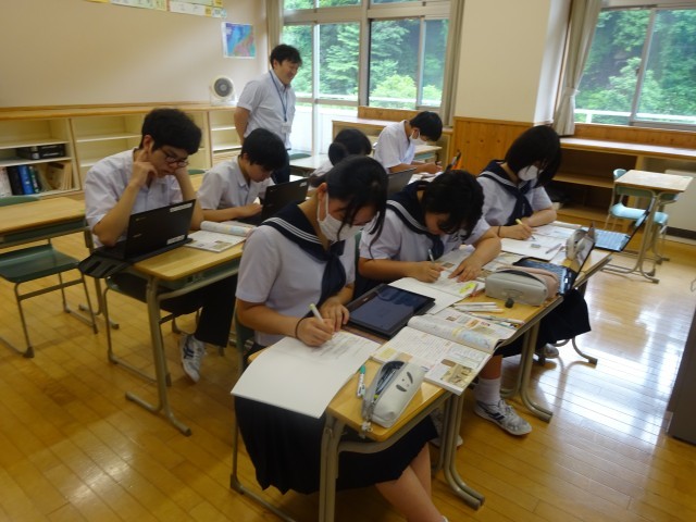 「江戸幕府はなぜキリスト教を禁止したのか」という課題について、教科書や端末で調べた内容をまとめました。3年生はスライドを使う生徒が多かったのですが、2年生はノートにまとめている生徒が多かったです。自分に合ったまとめ方で理解を深めています。