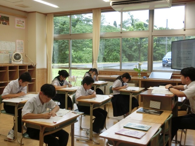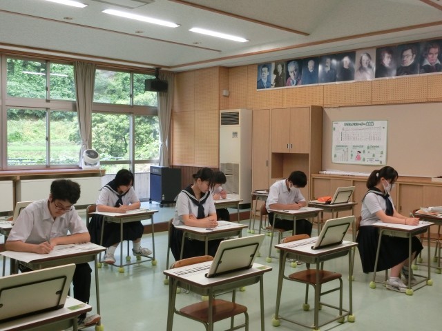 本日から1学期末評価が始まりました。1年生は社会、2年生は音楽、3年生は美術のテストに真剣に取り組んでいます。今までの勉強の成果を出し切ろう!