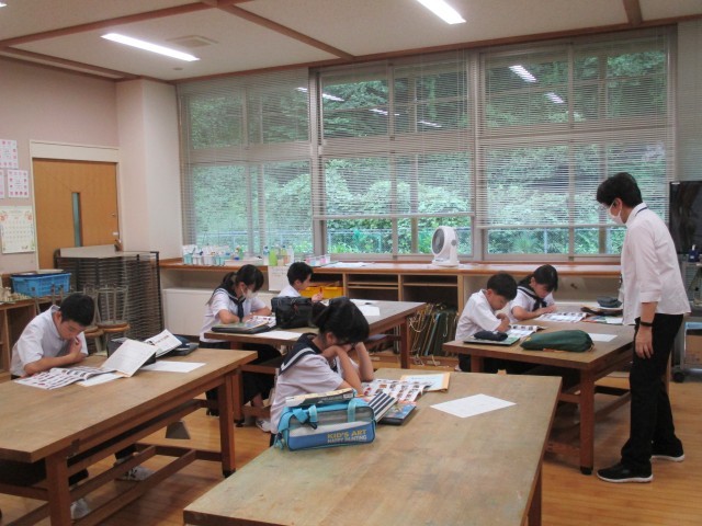 焼き物制作に向け、焼き物の特徴や制作手順を学びました。先輩たちの作品を見本に、作りたい焼き物の形や色等をイメージしながら話を聞きました。