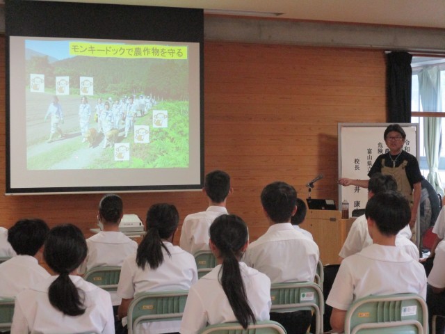 中央農業での取り組みや室井校長先生自らが自宅で行っている栽培方法を写真や映像を使いながらわかりやすく教えていただきました。モンキードックでサルの獣害から守る取り組みなど本校の校区とも関わりがある活動もされていると聞いて身近にあるということを改めて知りました。また、トマトに枝豆と一緒に植えるコンパニオンプランツなどの栽培方法を学び、室内農園をしている2年生にとっても参考になりました。