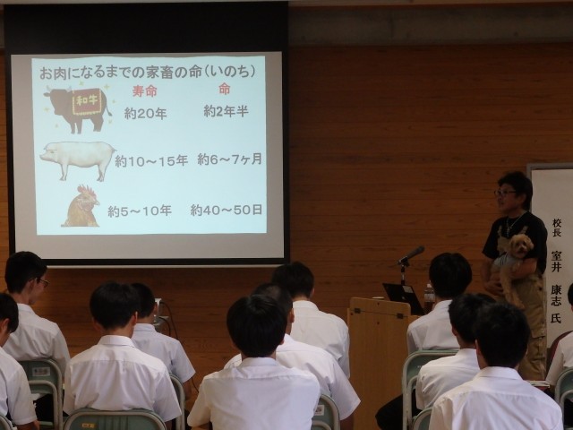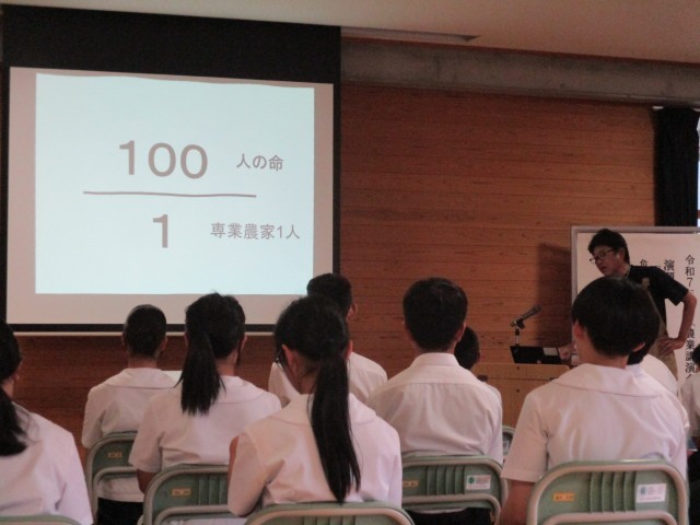 また、牛、豚、鶏の家畜の本来の寿命や出荷されるまでの期間、専業農家1人に対して100人の食料をになっていて命を預かっている大切な職業であること、ドローンやAIなどの最先端の科学技術を用いて、1人あたりにになえる面積が増えているなど今までの農業のイメージ変わるお話しも聞くことができました。