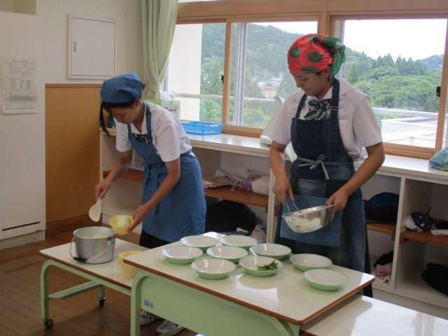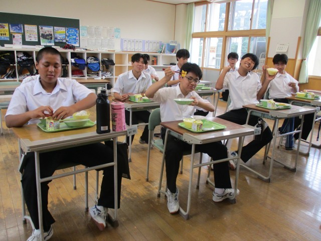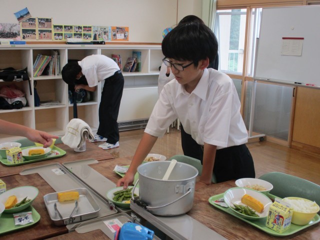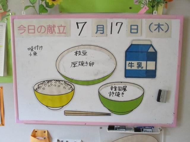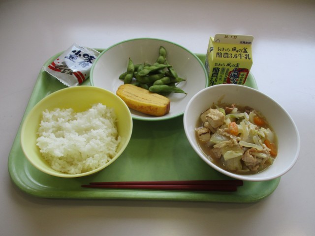 厚焼き玉子と韓国風すき焼きは甘めで、いくつでもたべられます!枝豆も生徒たちはいくつあっても食べられると評判で夏の定番メニューです。今日は射水市産の富山ブラック枝豆です!味付け小魚はサクサク、あまあま、カルシウム豊富です!
