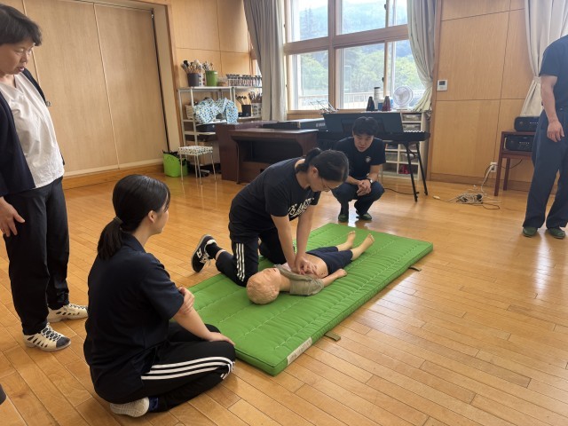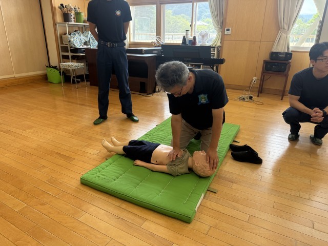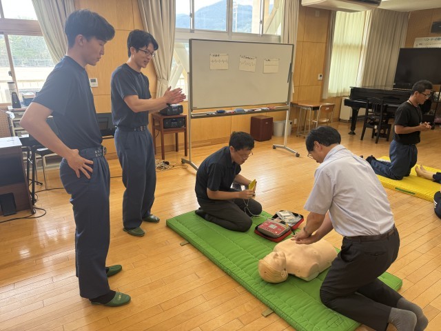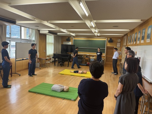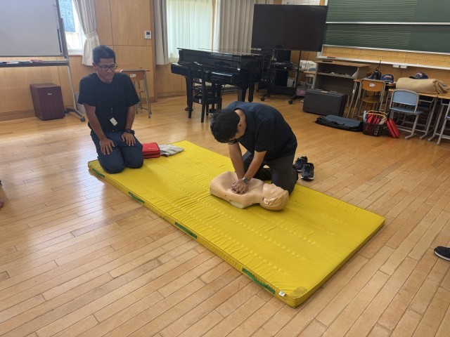 本日、大沢野消防署細入分遣所から講師を招いて本校教員で救急救命講習を行いました。年齢や体格に応じた胸骨圧迫の正しい方法やAEDの使い方を確認しました。