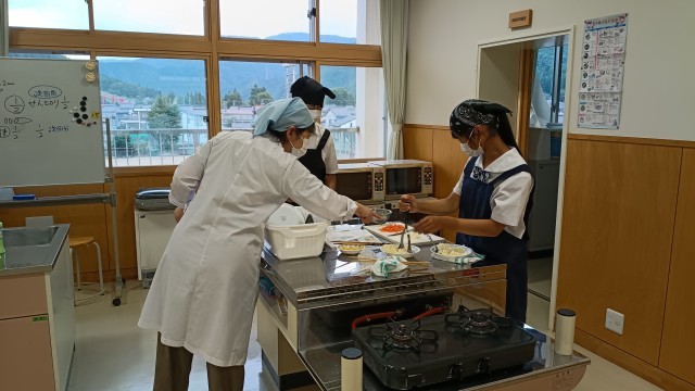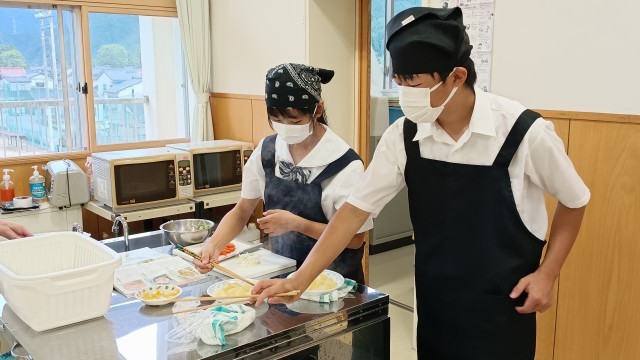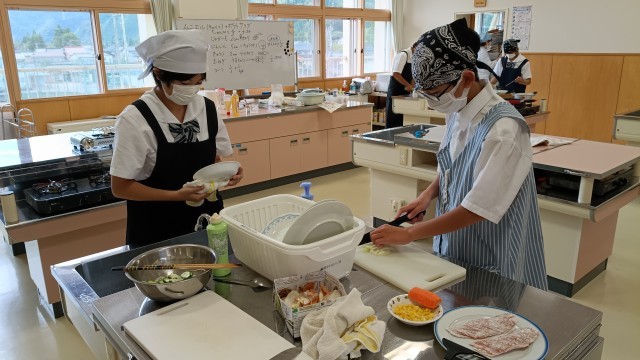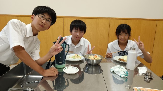 1年生は家庭科調理実習で、魚のムニエル、ポテトサラダ、キャベツの千切りを分担し調理を進めて最後は美味しく実食。
