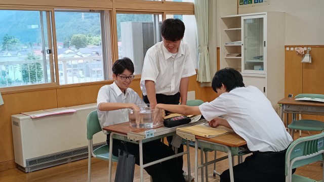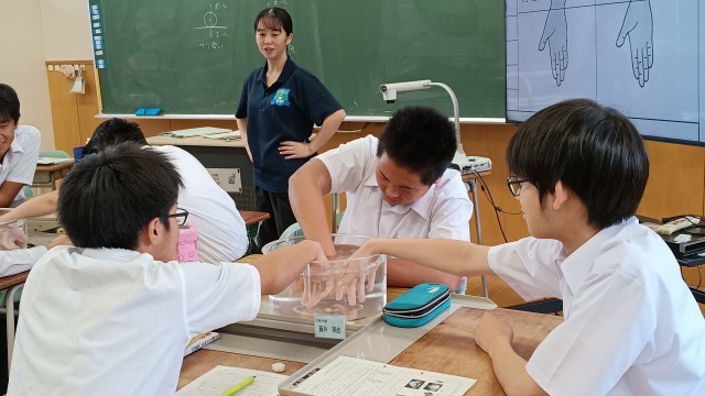 3年生は理科、水圧の変化について水槽の中に手を入れて水圧の変化を実感体験していました。