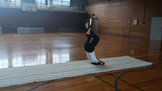 1年生は保健体育、マット運動で倒立の練習をしてました。